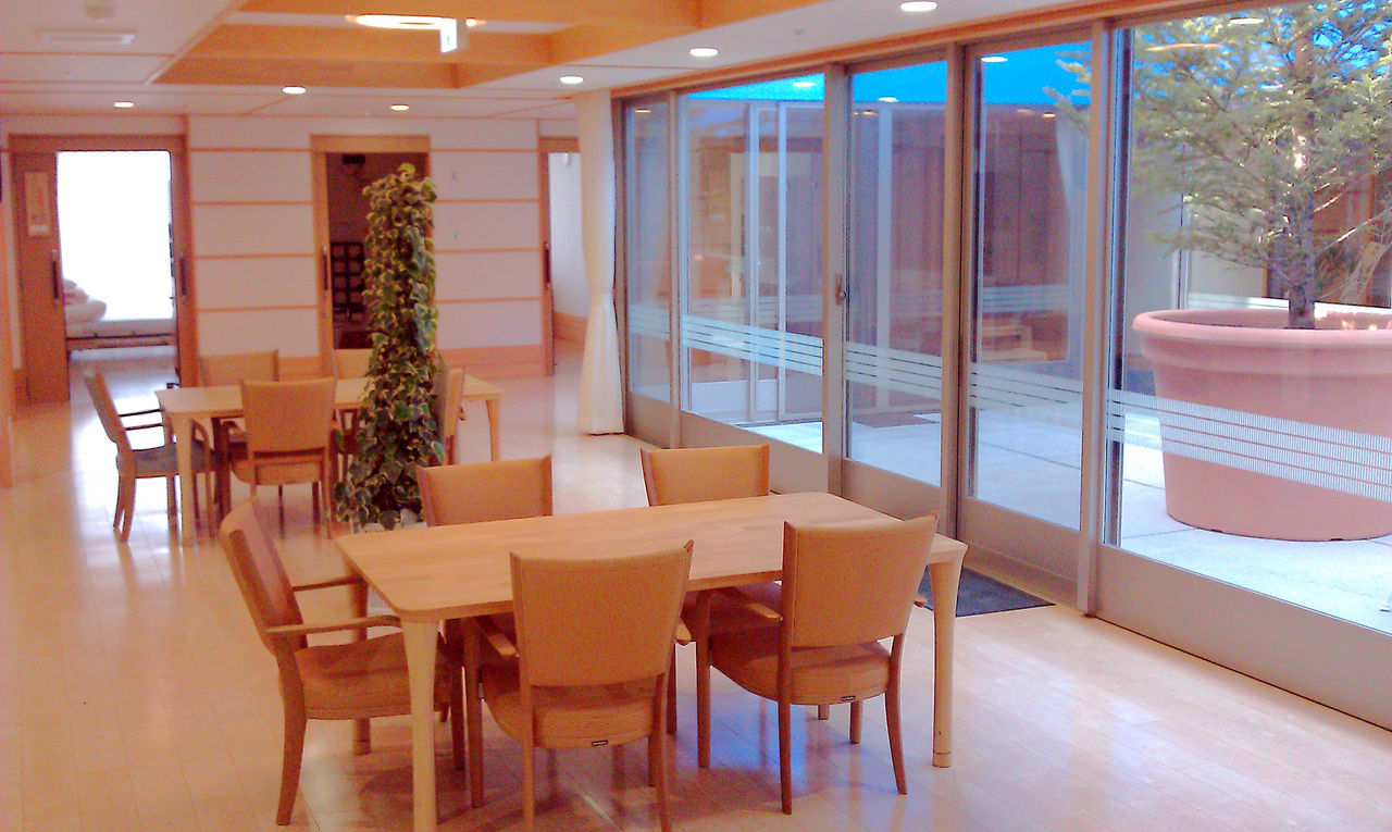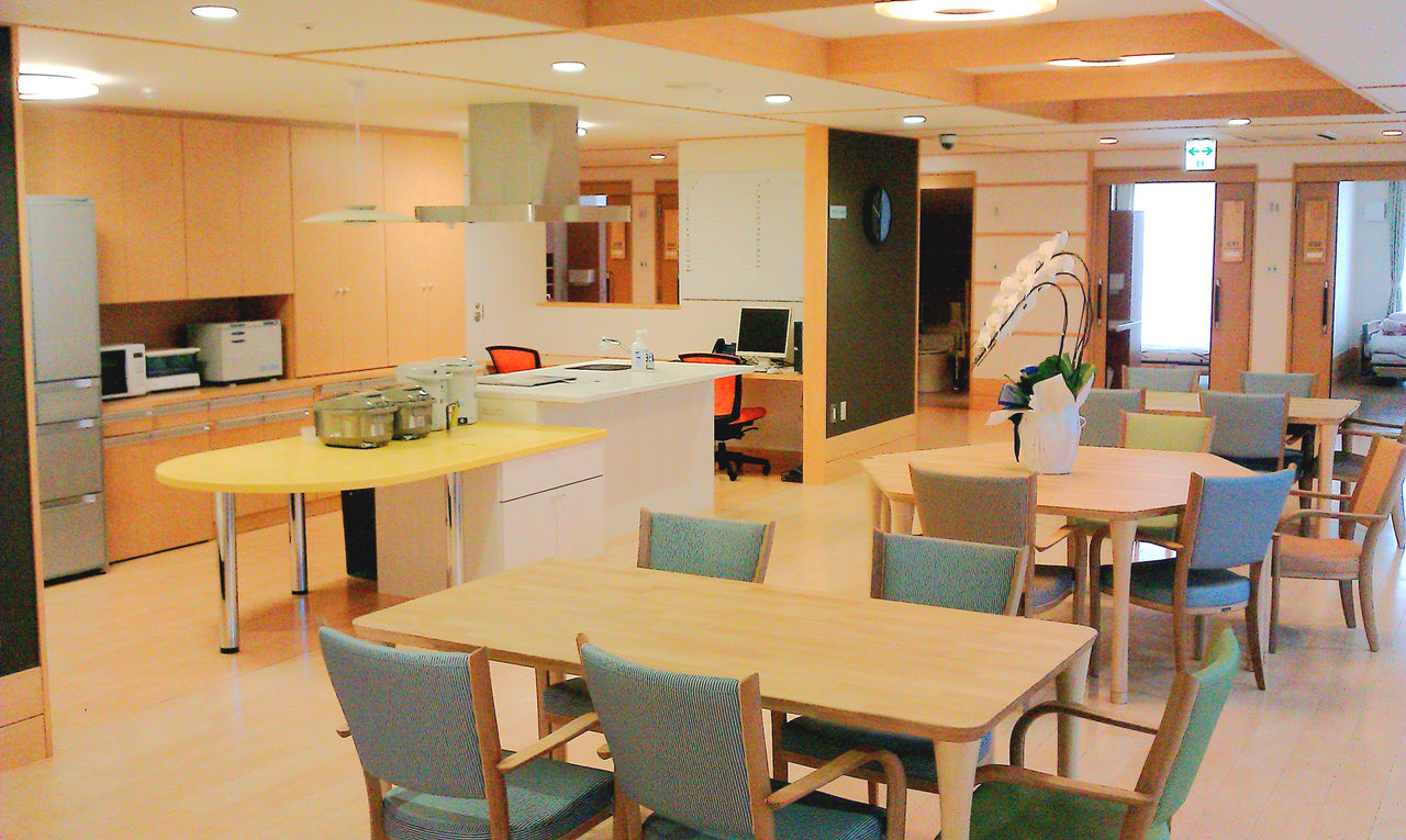 こちらは、デイサービスのフロアになります。テーブルなどの家具も配置されて